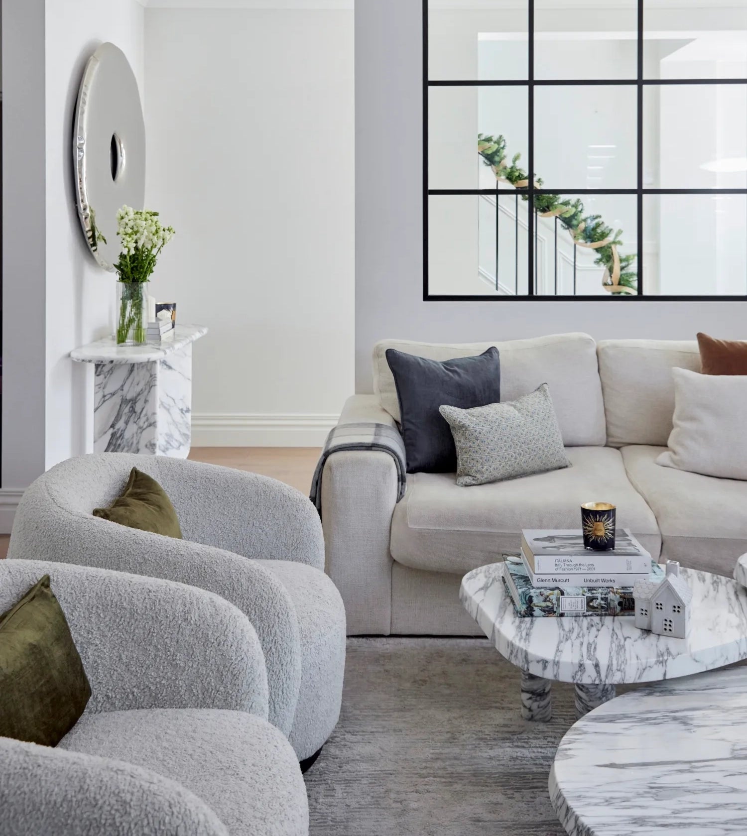 From the soft boucle armchairs in the living room to the Arabescato marble centrepieces and layered metallics throughout, every detail speaks to a considered, contemporary Australian aesthetic. For this project they took our Franklin Sofa and customised the seat cushions to adapt the style to the needs of the client.