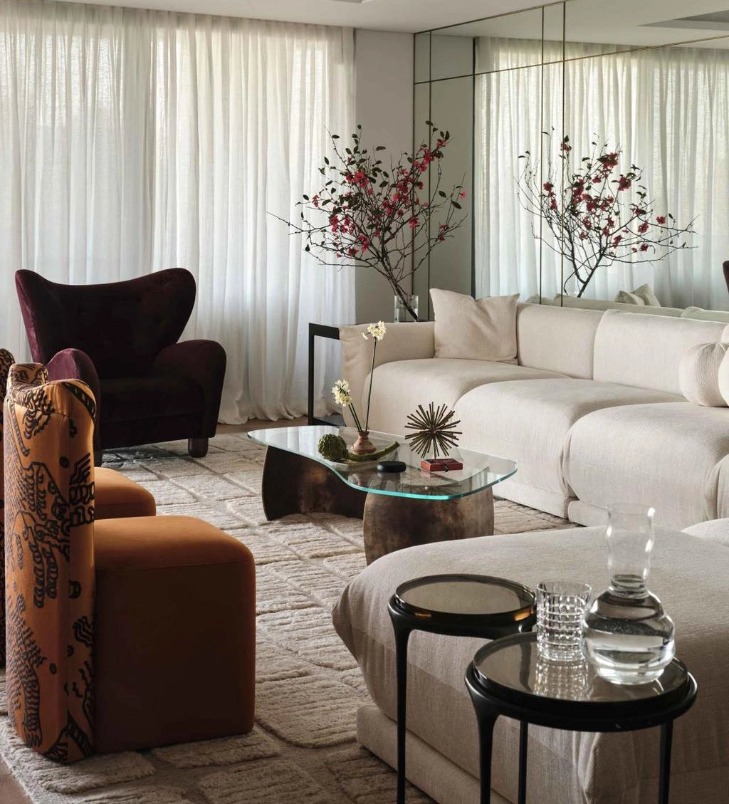 “The vision for this piece was all about quiet sophistication — something sculptural yet inviting, that could hold its own within the architectural drama of the space,” says Rahul Raja, Director at Crafted. “We worked closely with Smac Studio to ensure every detail felt intentional, from the curve of the arms to the texture of the fabric.”